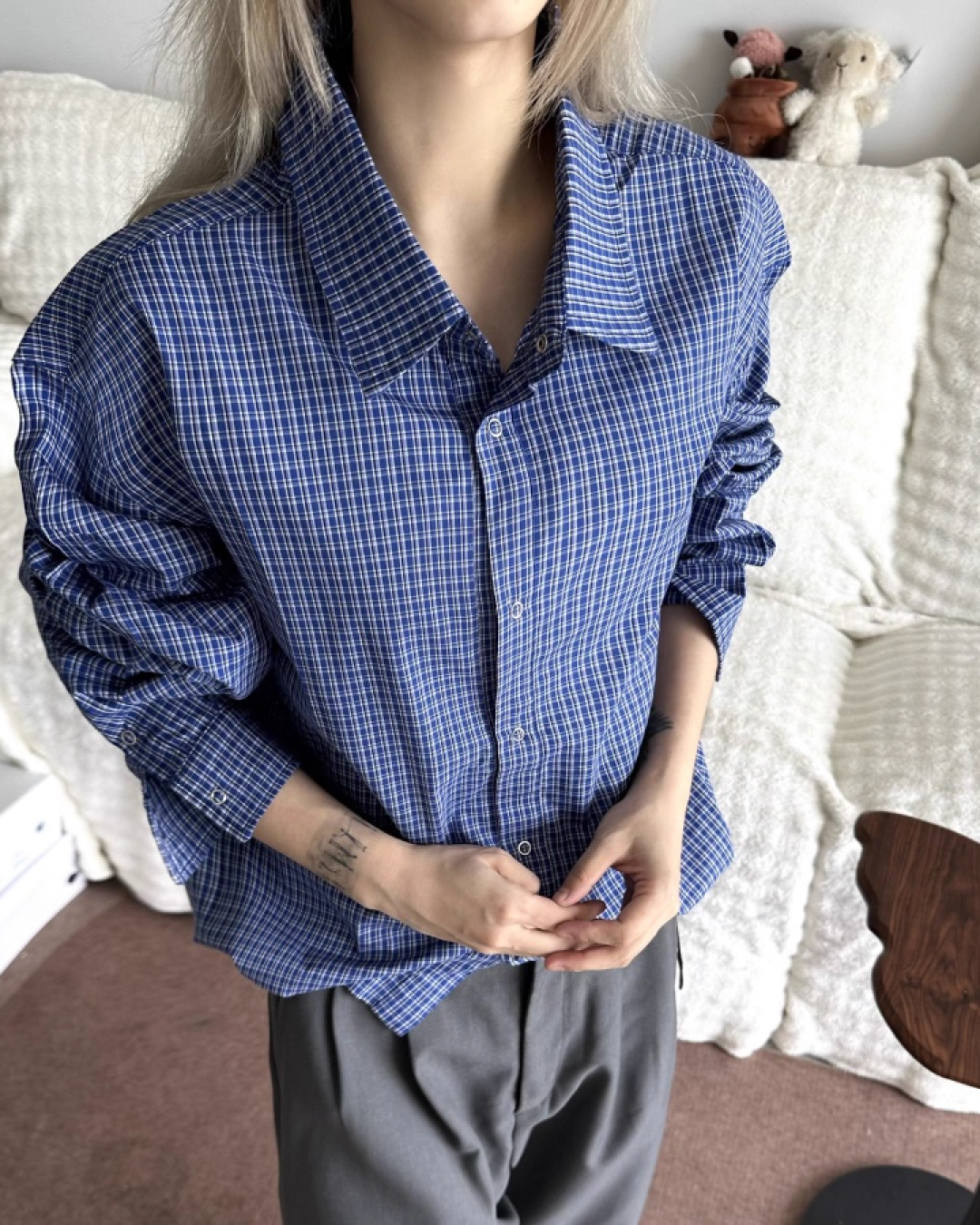 ロングスリーブドローコードブルーチェックシャツ B0038